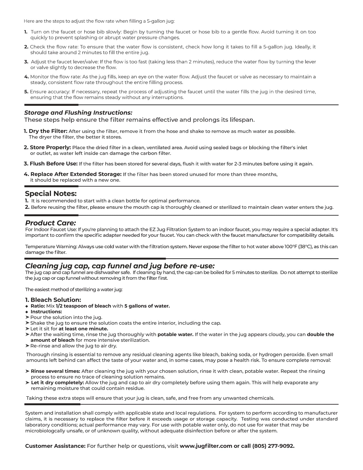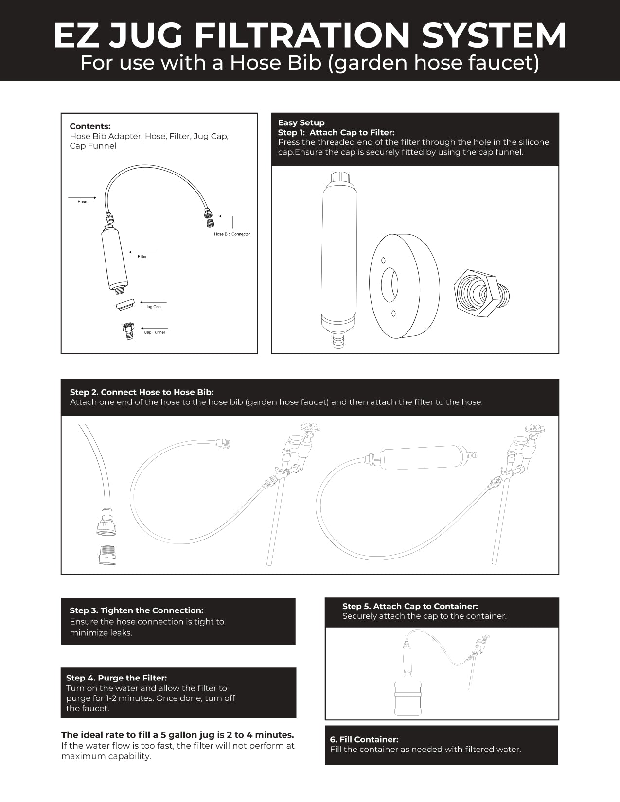 Enjoy the convenience of pure, great-tasting water straight from your garden hose faucet or kitchen faucet with the EZ Jug™ Filtration Kit. This complete kit includes an advanced EZ Jug™ filter, a flexible connecting hose, and an indoor adapter—making it simple to hook up to bothstandard indoor and outdoortaps.